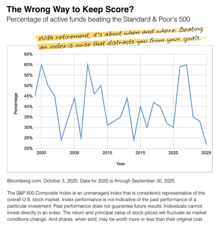 The purpose of a retirement strategy is to get where you want, when you want to be there. When I see articles saying, “active money managers struggle to beat index funds due to tariffs, economic uncertainty,” I believe we’re missing the point. Whether an investment underperforms or outperforms is fun to look at, but it’s about whether the investment helped your where and when.